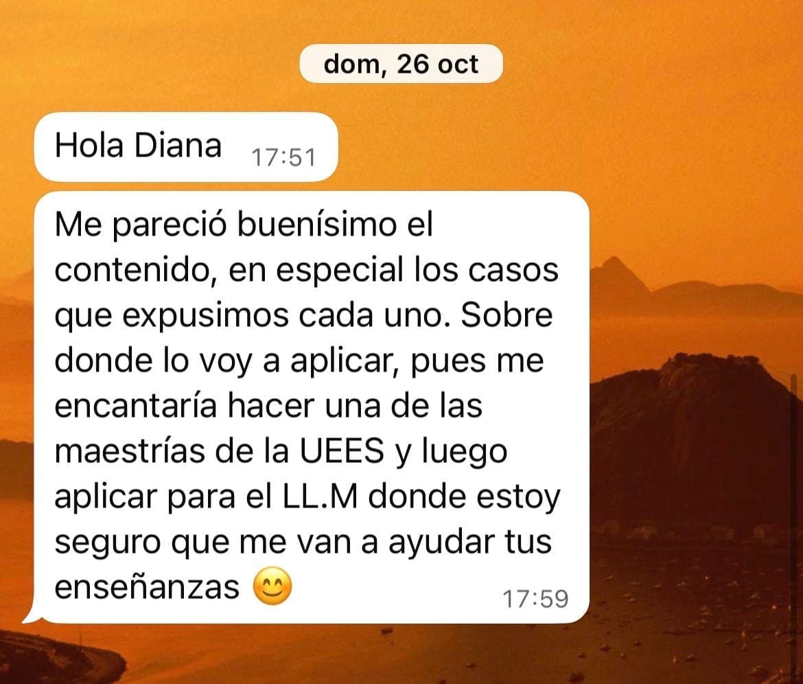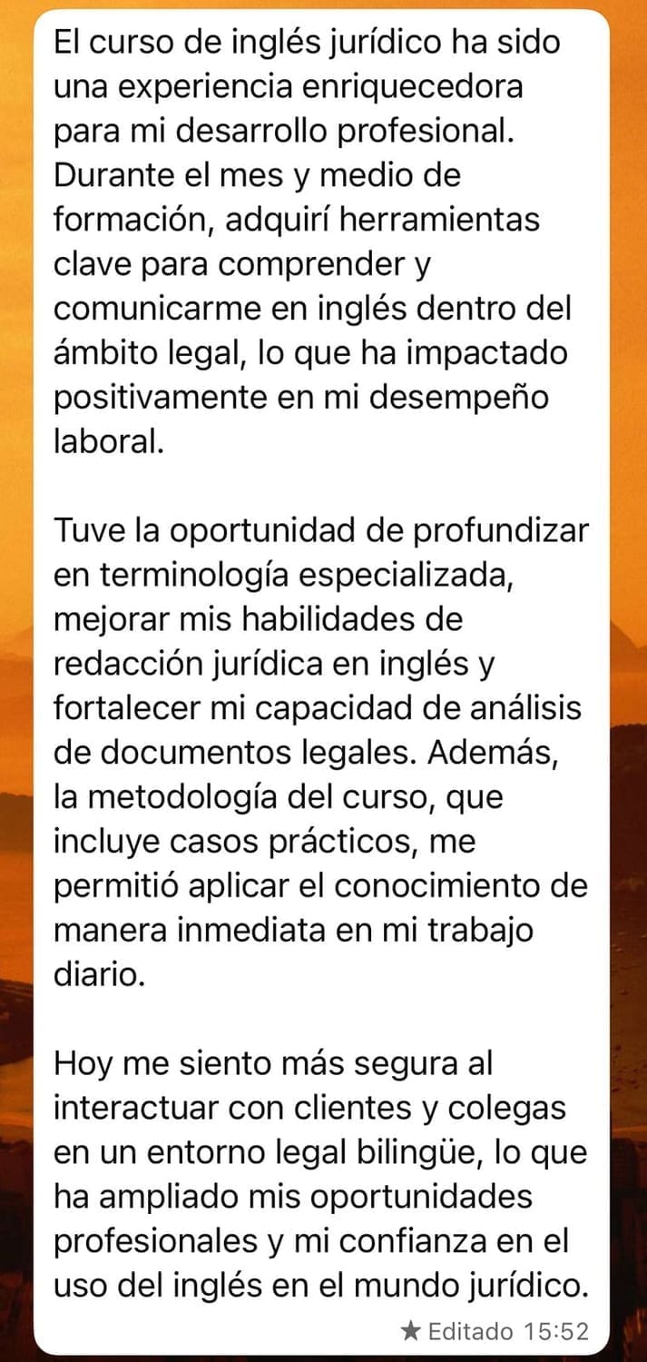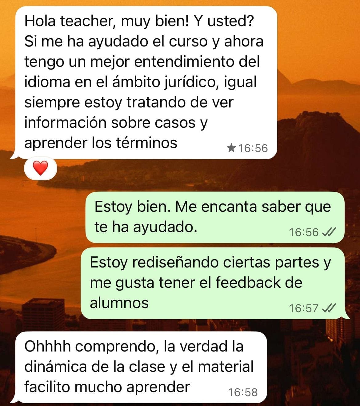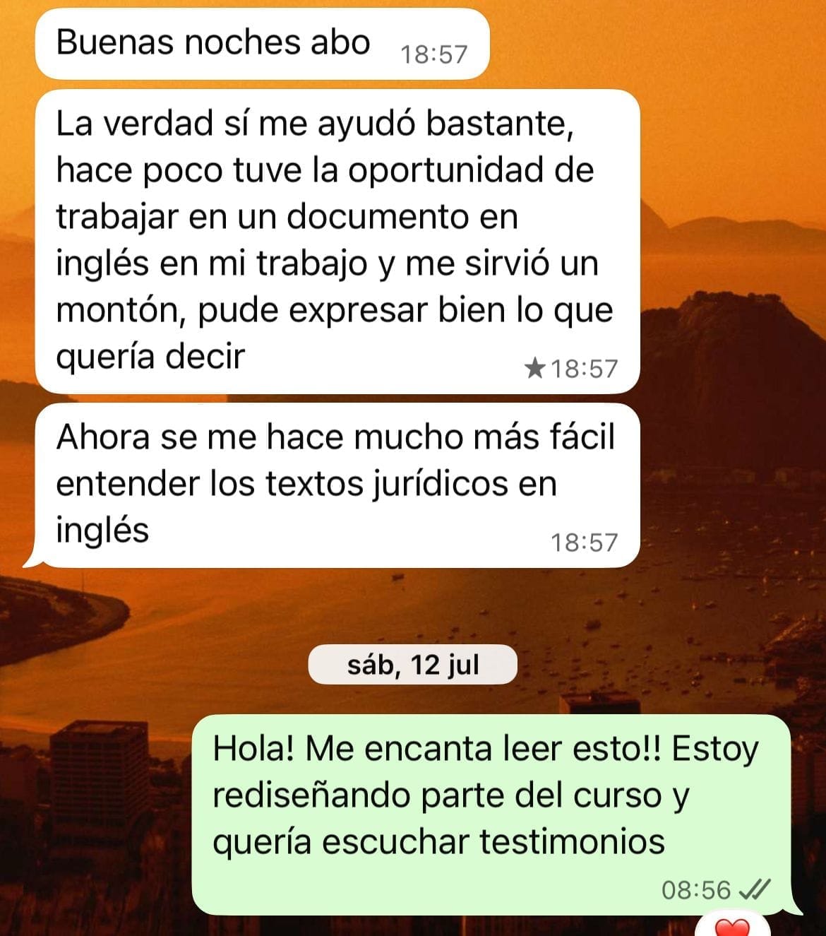 "Sí, me gustó mucho el curso, siento que aprendí bastante y sí me ha sido útil, por ejemplo cuando escucho noticias de usa en inglés,y tratan de temas jurídicos ahora tengo más comprensión del contexto de lo que hablan. Sí le soy sincera más escucho noticias legales, o vídeos en youTube de procesos legales, como juicios que llevan en usa, más que leer un texto en específico.