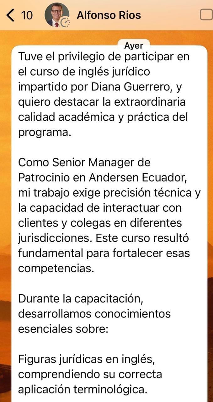 Inscríbete en Legal English Mastery, un programa integral de 10 semanas con clases en vivo, recursos prácticos y acompañamiento personalizado.