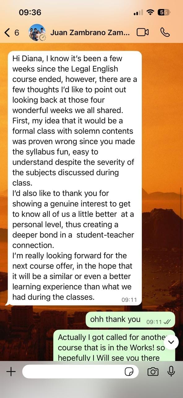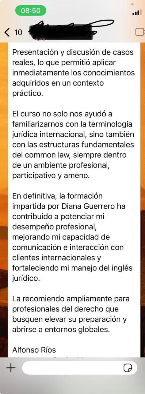 The course structure was well-balanced between theory and practice, with real case simulations, writing exercises, and oral argumentation sessions that helped me feel more confident when dealing with international clients and legal documents in English. I particularly appreciated the focus on precise legal drafting and the opportunity to expand my vocabulary in areas such as corporate formation, contract remedies, and third-party rights.