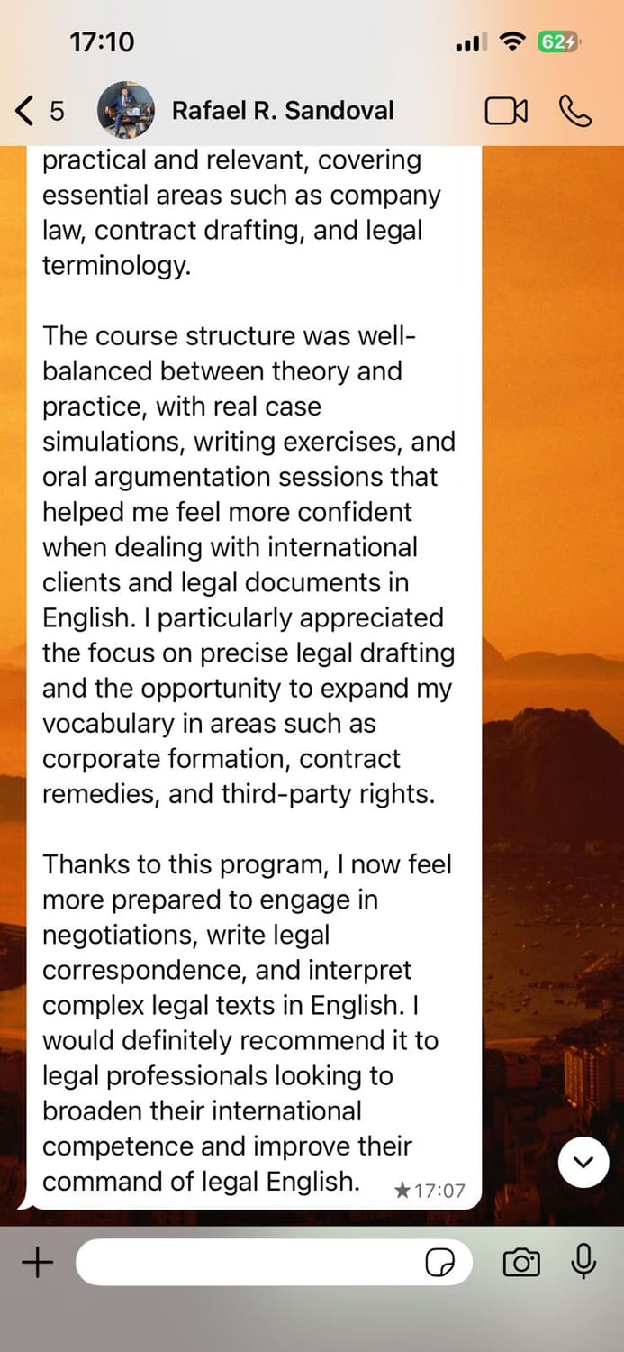 ✅ Domina estructuras, vocabulario y prácticas como revisión de contratos, redacción legal y comunicación profesional.